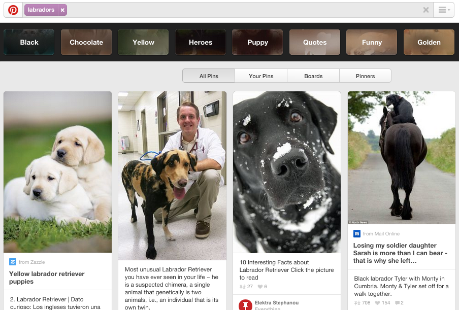 Custom categories: Pinterest features 32 categories that range from animals and architecture to weddings and women’s fashions, and only those categories used to be served up to users. Now Pinterest has added custom categories based on your search. So, instead of slogging through the animals category to find photos or videos of Labs, you can now search on “Labradors,” which is not only its own category but also serves up even more specific custom categories, as you can see here.